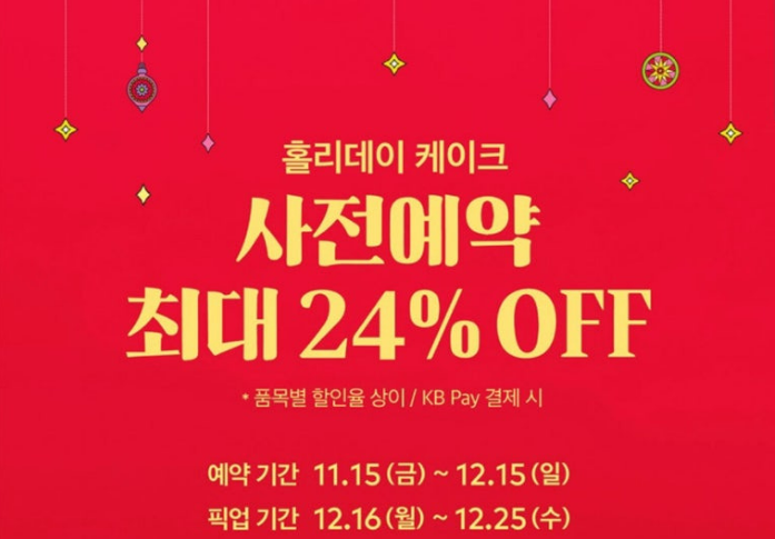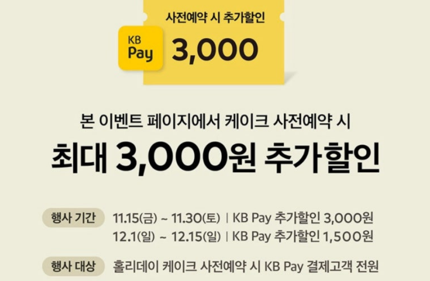 사전예약 시 받는 할인 혜택은 케이크 종류에 따라 다르지만, 10% 또는 15% 할인 받을 수 있어요. 그리고 사전예약 기간 내에 KB페이로 결제하면 추가로 할인도 제공되니, 결제 방법도 신경 써 주세요!