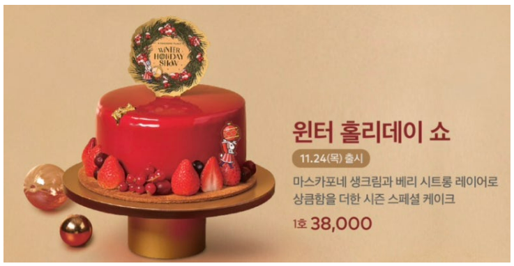 - 맛: 레어 치즈 무스와 패션&라즈베리 콩포트가 만나 새콤달콤한 맛이 일품이에요. 레드 글레이즈로 크리스마스 느낌을 살린 디자인도 매력적입니다. 크리스마스 분위기를 제대로 살려줄 케이크!