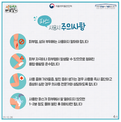 파스는 몸에 직접 붙이거나 바르는 형태로 사용되는 만큼 부작용이 생기기 쉽습니다. 따라서 안전하게 사용하기 위해서는 다음과 같은 방법을 기억해두는 것이 좋습니다.