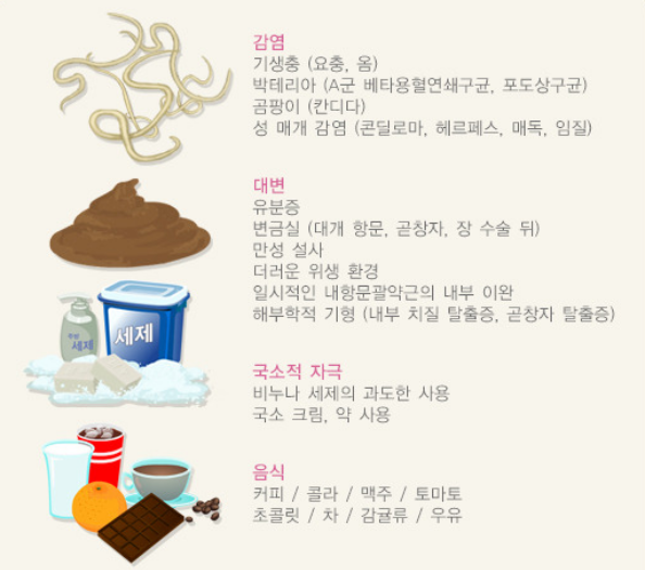 - 습진: 항문 주변 피부에 염증과 가려움증을 유발할 수 있습니다.