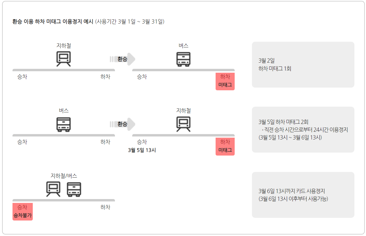 후불 기후동행카드를 사용할 때는 반드시 하차 태그를 해야 합니다. 하차 태그를 하지 않으면 2회 누적 시 24시간 동안 교통카드 사용이 정지됩니다. 이 점을 꼭 기억하고 교통카드를 사용할 때마다 내릴 때 태그를 하세요.