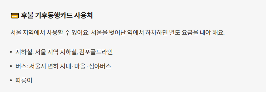 이 카드는 서울 지역 지하철, 김포골드라인, 서울 시내·마을·심야버스, 그리고 따릉이까지 사용할 수 있습니다. 서울을 벗어난 역에서 하차하면 별도의 요금이 발생하므로, 유의해야 합니다.