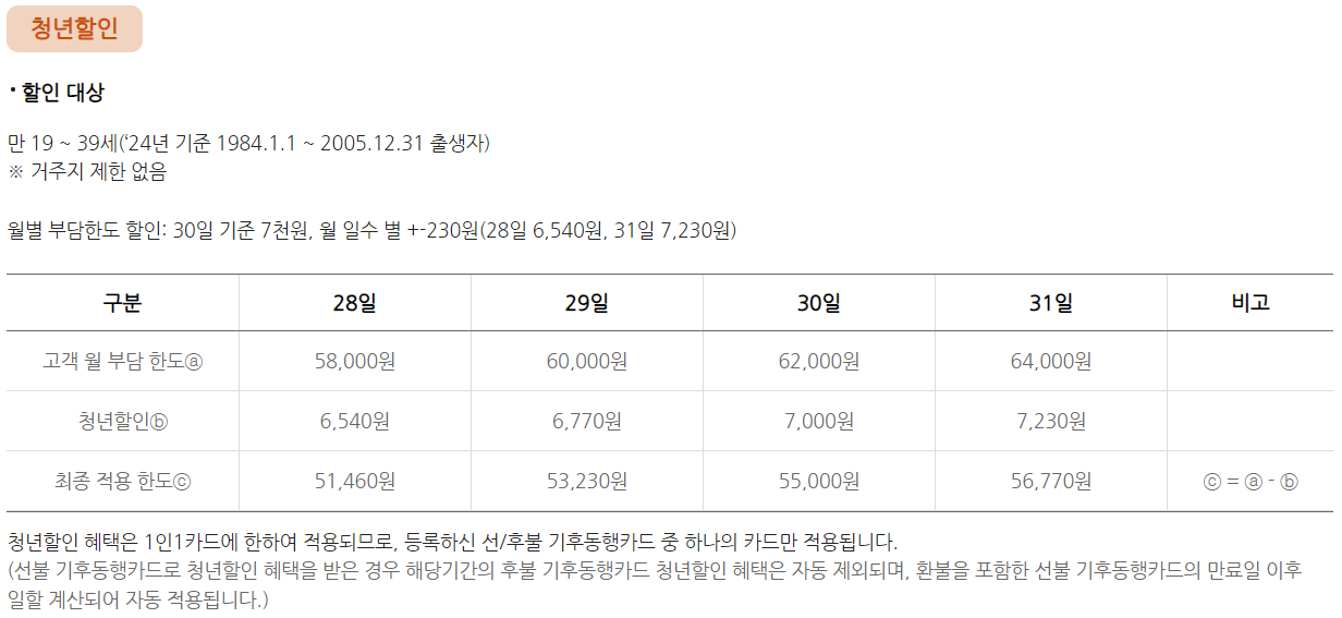 청년 할인 혜택도 제공되며, 만 19세에서 39세 청년이라면 월별 일수에 따라 최대 7,000원까지 할인 혜택을 받을 수 있습니다.