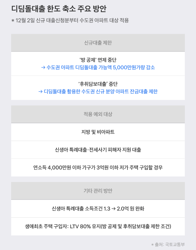 - 수도권 아파트 대상 적용: 12월부터 수도권 아파트에 대해 디딤돌대출 규제가 시행되어 대출 한도가 줄어듭니다.