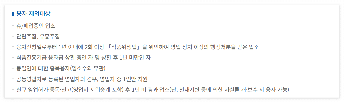 | 식품접객업소 화장실 개선 | 2천만원 | 연 1% | 2년거치3년균등분할상환 |