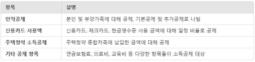 - 소득공제는 세금을 계산하는 기준인 '소득'을 줄여주는 방식입니다. 생활 속 지출을 포함한 다양한 항목들이 소득공제 대상에 포함됩니다.