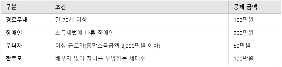 부양가족이 특정 조건을 만족하면 추가공제를 받을 수 있습니다. 주요 조건과 공제 금액은 다음과 같습니다: