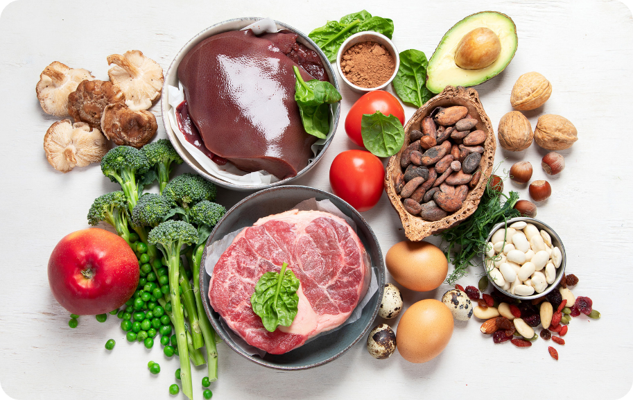 - 철분: 붉은 고기, 닭고기, 생선, 두부, 시금치