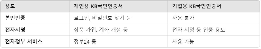KB국민인증서는 보안카드나 OTP 없이 간편하게 로그인할 수 있는 인증서입니다. 개인용과 기업용으로 나뉘며, 간편한 비밀번호나 생체 인증(지문, 얼굴 인식)으로 로그인할 수 있습니다.