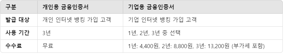 - 전자세금용 공동인증서: 전자세금계산서 발행 및 관련 업무에만 사용. 연간 110,000원(부가세 포함).